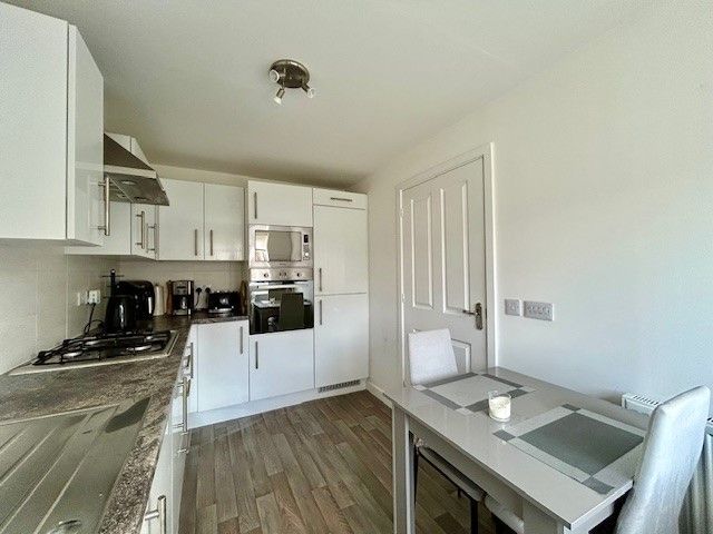Fitted with a range of base, drawer and wall units, complementary work surfaces with inset sink unit and tiled splash backs. Integrated gas hob, stainless steel extractor hood, eye level electric oven and microwave, space and plumbing for washing machine. Window to the front elevation and radiator.